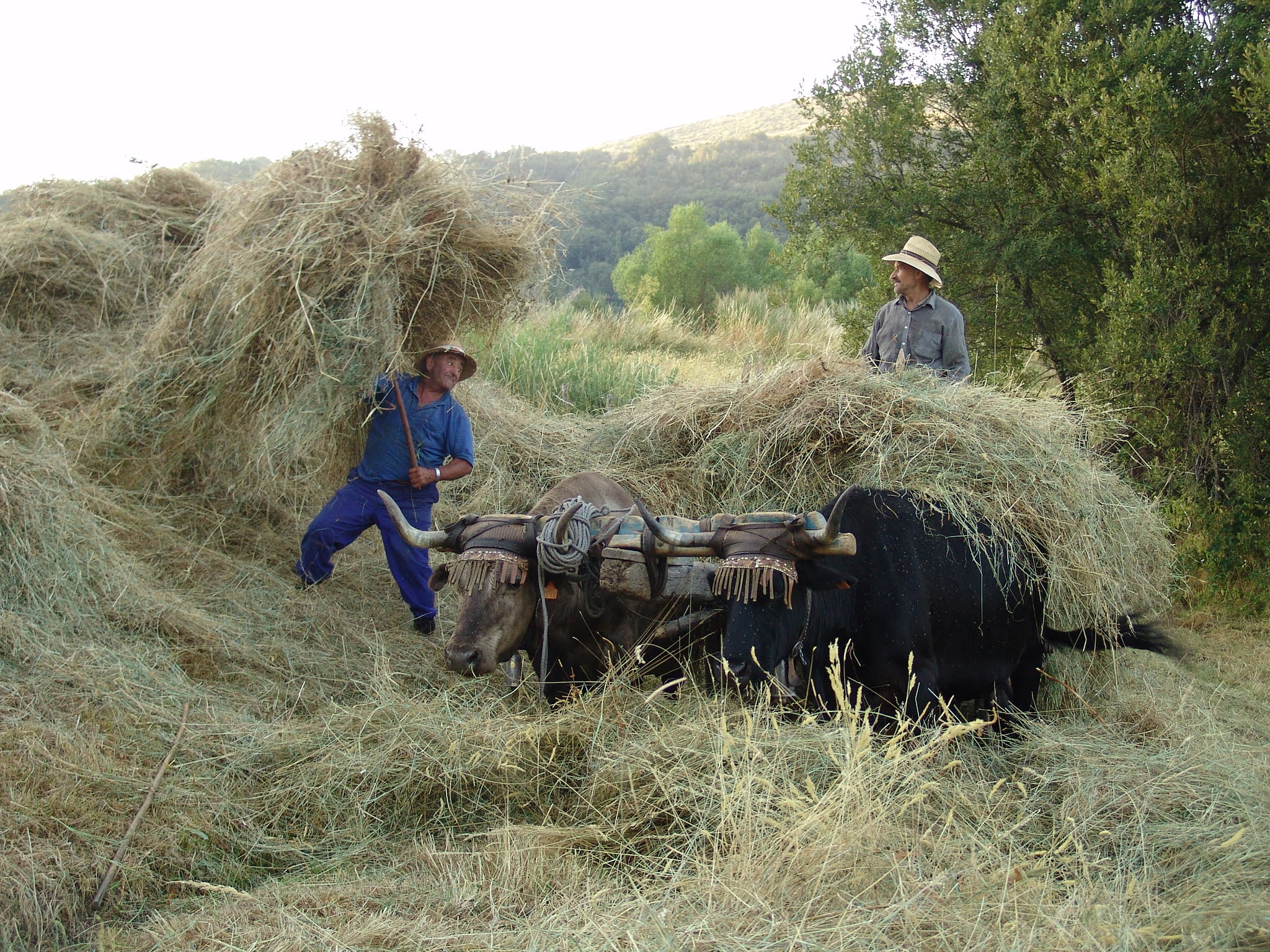 Arrastrando el heno con los bueyes.